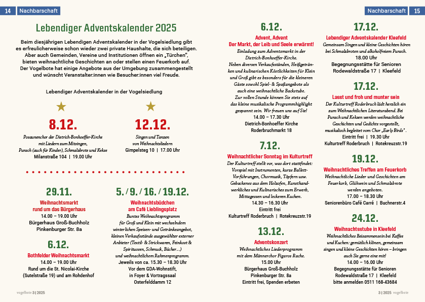 Natürlich öffnen auch Gemeinden, Vereine und Institutionen ein „Türchen” und bieten weihnachtliche Geschichten und weihnachtliches Miteinander an. Der Vogelbote hat einige Angebote aus der Umgebung zusammengestellt. Zu finden in der Ausgabe 3|2025 auf den Seiten 14-15.